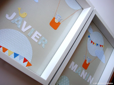 Amparo y Santiago asked us to make these personalized gifts to celebrate Javier and Manin´s Christening. We made a photo album with an inscription inside, two framed collage prints with the twins´ name on them and a decorative mobile. We decided to go with a cow theme because the twins’ mom loves cows, and the truth is that now we love cows too... [smile]
